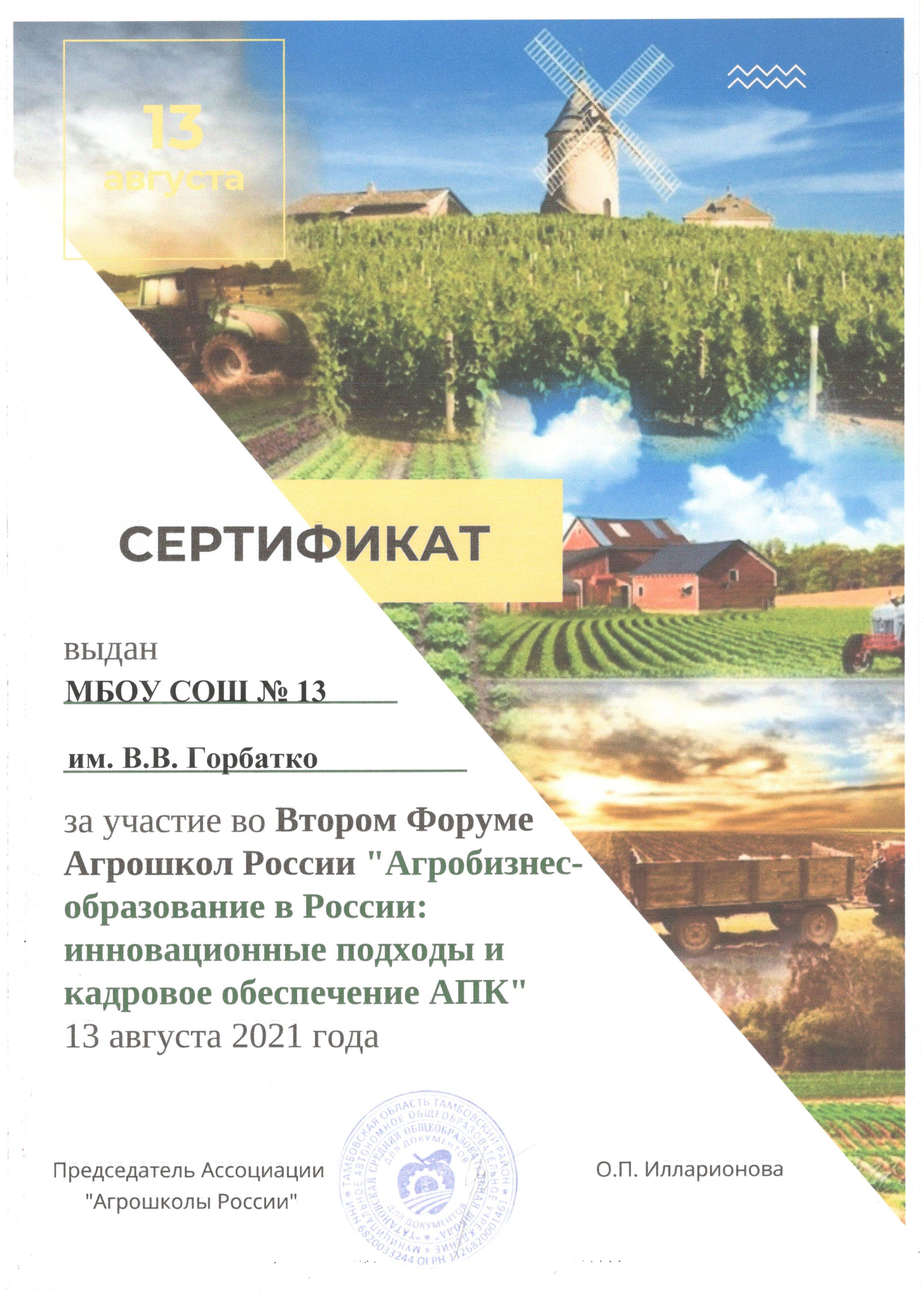СЕРТИФИКАТ УЧАСТНИКА II ФОРУМА АГРОШКОЛЫ РОСИИ "Агробизнесобразование в России: инновационные подходы и кадровое обеспечение в АПК", сертификат участника