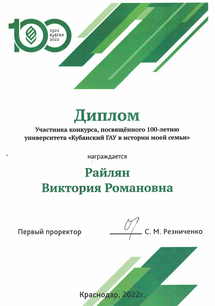 Диплом участника конкурса, посвященного 110-летию университета "Кубанский ГАУ в истории моей семьи"