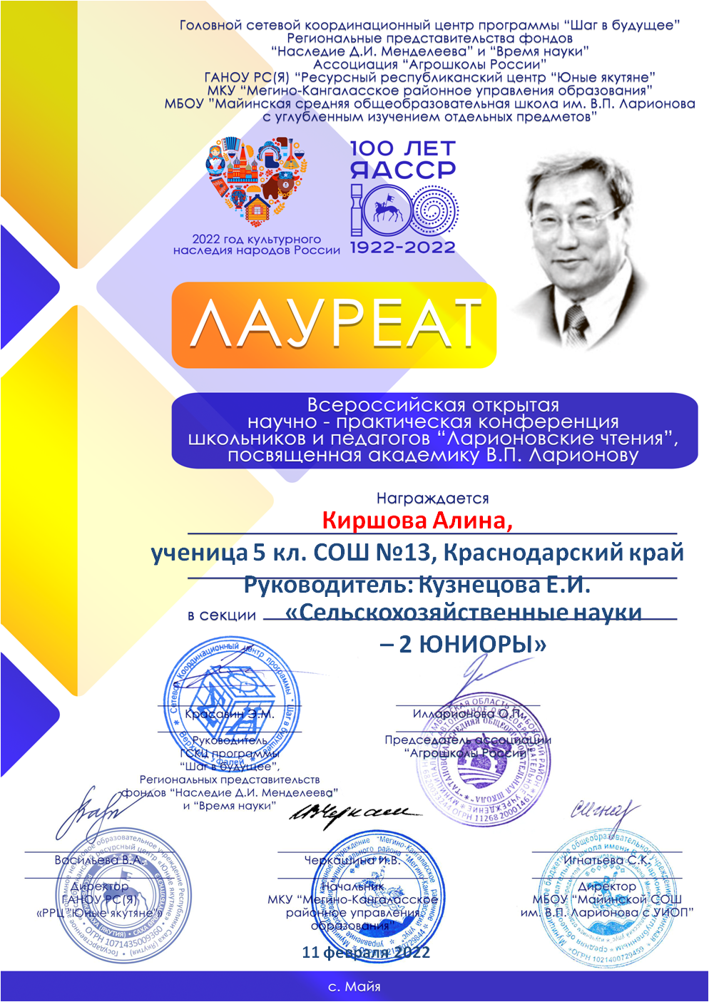 Липлом Лауреата XIII межрегиональной научно-практической конференции "Молодые исследователи Кубани"
