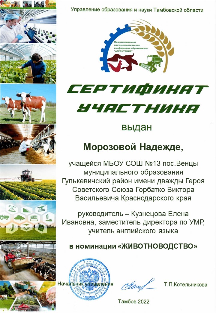СЕРТИФИКА участника Межрегиональной научно-практической конференции обучающихся "АГРОЧТЕНИЯ"